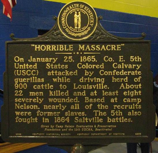 On January 25, 1865, while driving a herd of 900 government cattle to the slaughterhouses in Louisville, elements of the 5th United States Colored Cavalry (USCC) were attacked near Simpsonville, Kentucky by Confederate guerillas. About twenty-two troopers were killed, and as many as twenty were wounded during the incident. At least four troopers later died of their wounds. Based at Camp Nelson, Kentucky, nearly all of the 5th USCC’s recruits were former slaves.