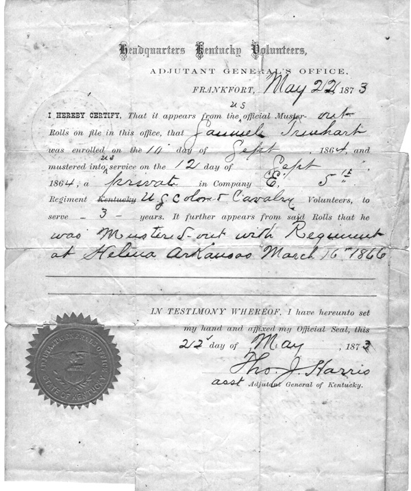 Samuel Truehart enrolled in the Union Army on September 11, 1864 at age twenty-one and was mustered into Company E of the 5th Regiment Cavalry of the United Stated Colored Troops on September 12, 1864 at Camp Nelson, Kentucky. According to Company E's Descriptive Book, he was 5' 7" tall, with black hair and black eyes and was a farmer at the time of his enlistment. The name of his owner at the time of enlistment was Lewis Young. Based on his various official reports, we have determined that Samuel was shot in the lower leg during the first Battle of Saltville (Burbridge' s (9/64-10/64). According to his compiled service record, Samuel Truehart was hospitalized at the Convalescent Camp, U.S.A. Hospital at Camp Nelson for an unknown reason, but possibly due to the gunshot injury, from October 14, 1864 until he returned to active duty in December 1864. We are unable to determine whether Samuel was released from the hospital in time to participate in Stoneman's (12/64) successful raid on Saltville. Official records also indicate that Samuel was present for the ambush of Company E of the 5th USCC by Confederate guerrillas in Simpsonville, Kentucky on January 25, 1865. Truehart and the 5th USCC were transferred to garrison duty in Helena, Arkansas in August 1865 for the remainder of his service and mustered-out on March 16, l866.